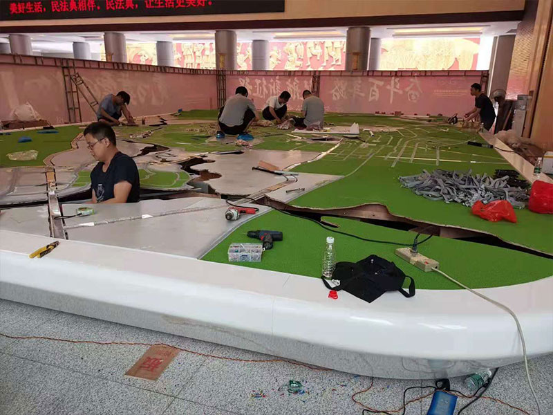 沙盤上揮灑著師傅們辛勤的汗水,沙盤模型組建完成,另一波師傅又在緊鑼密鼓的搭腳手架,墻壁布線,為安裝LED大屏做準備,有條不紊的忙活著。